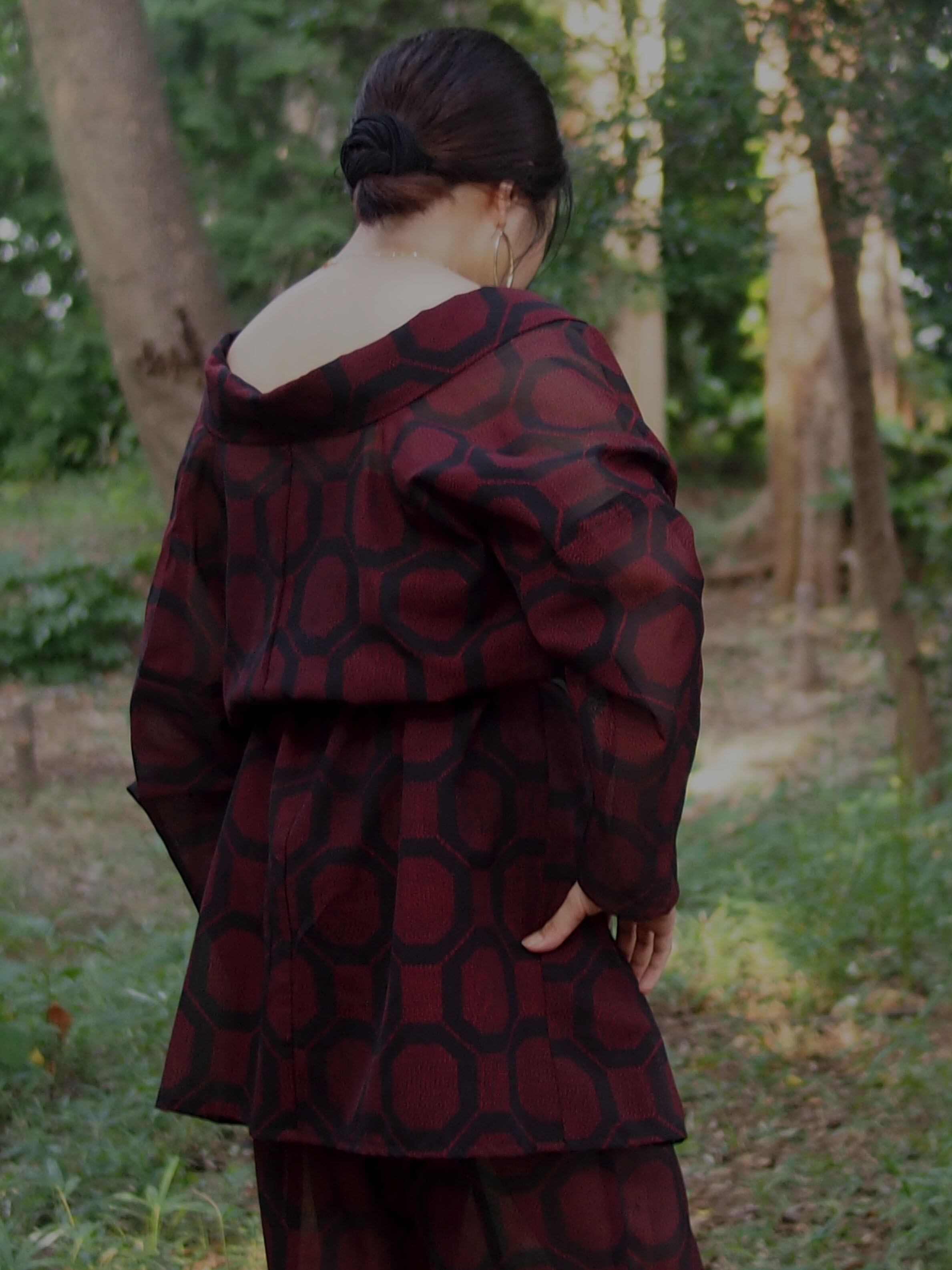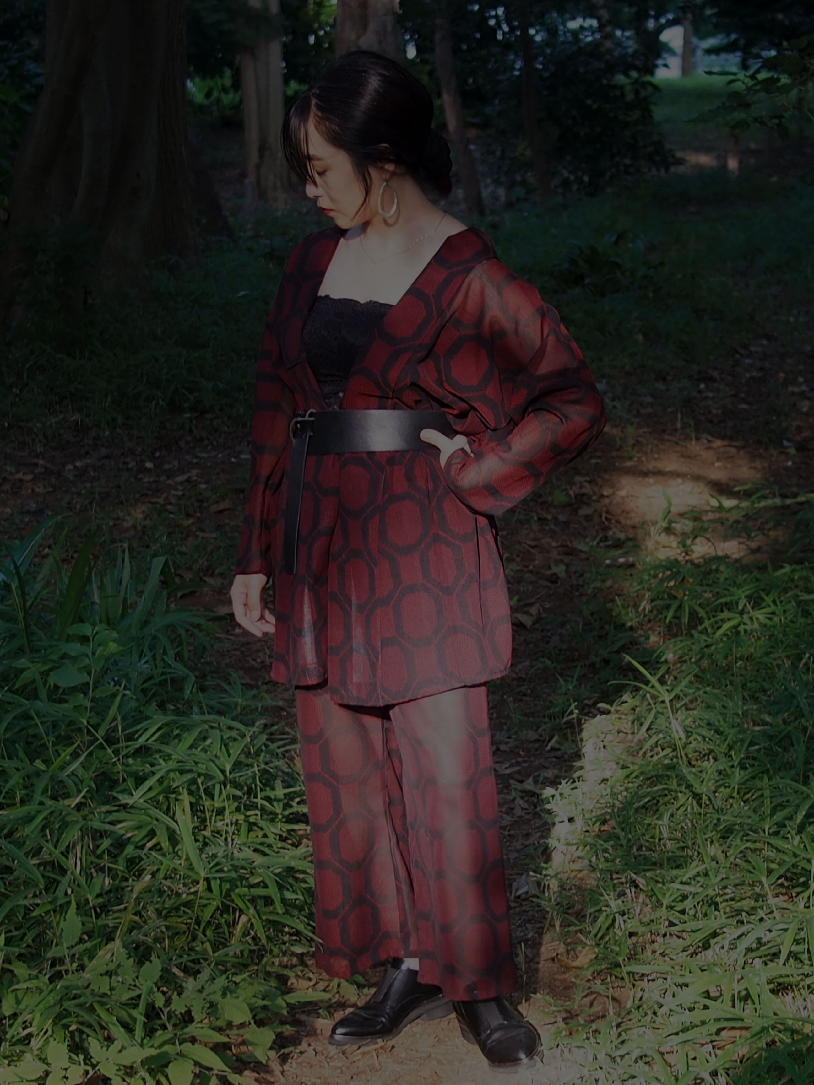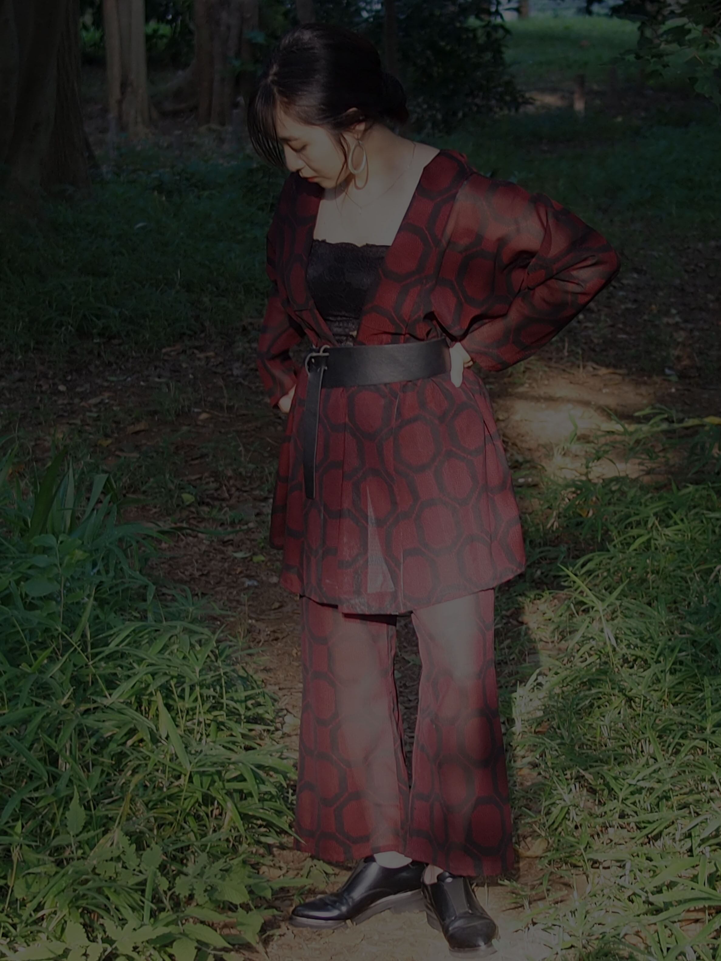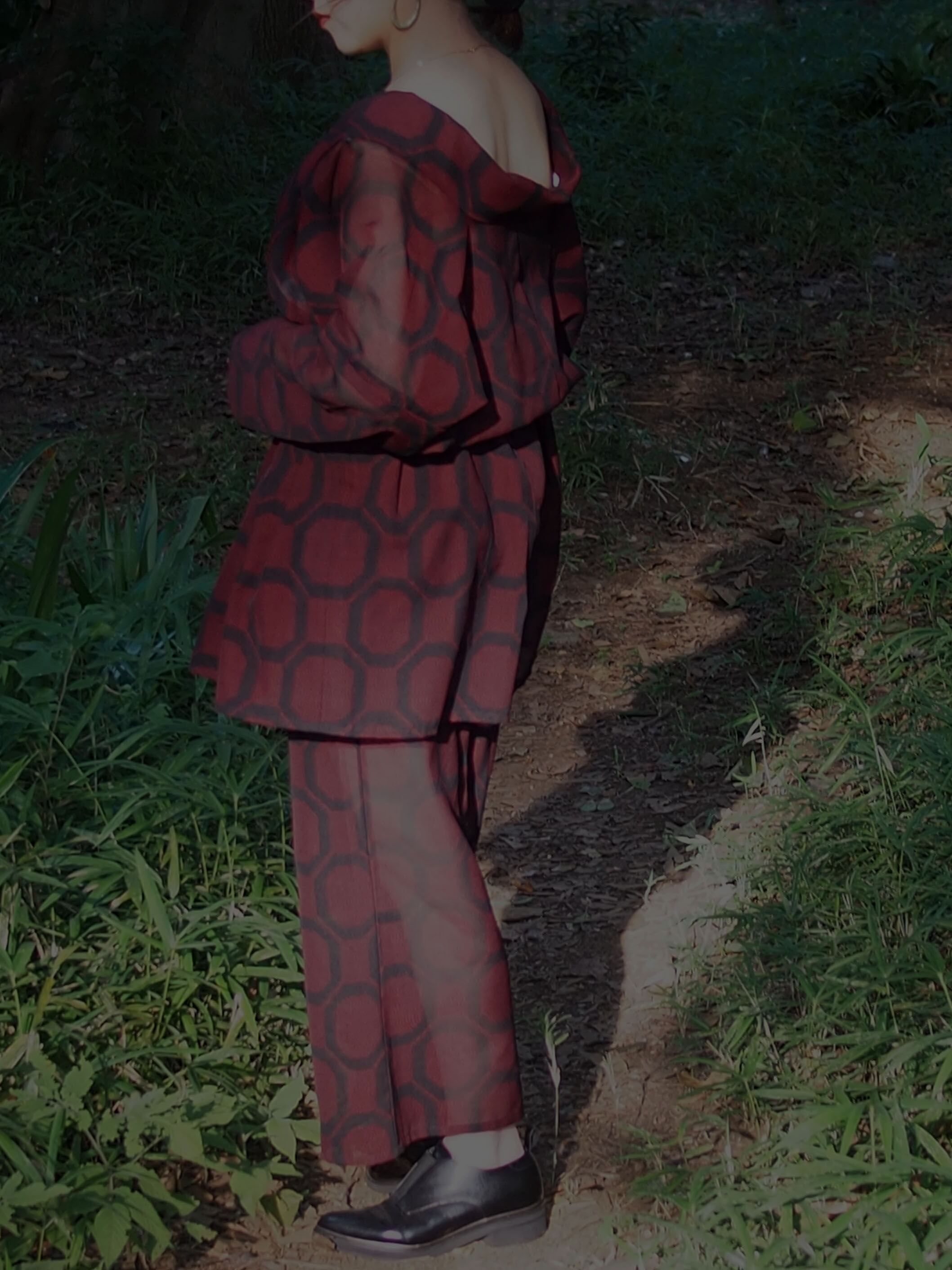 ワインレッドに大判の柄生地がシースルーに透け、なんとも素敵で深みのあるヴィンテージ感を漂わせます。モードな雰囲気で着こなせるお洒落な一枚です。