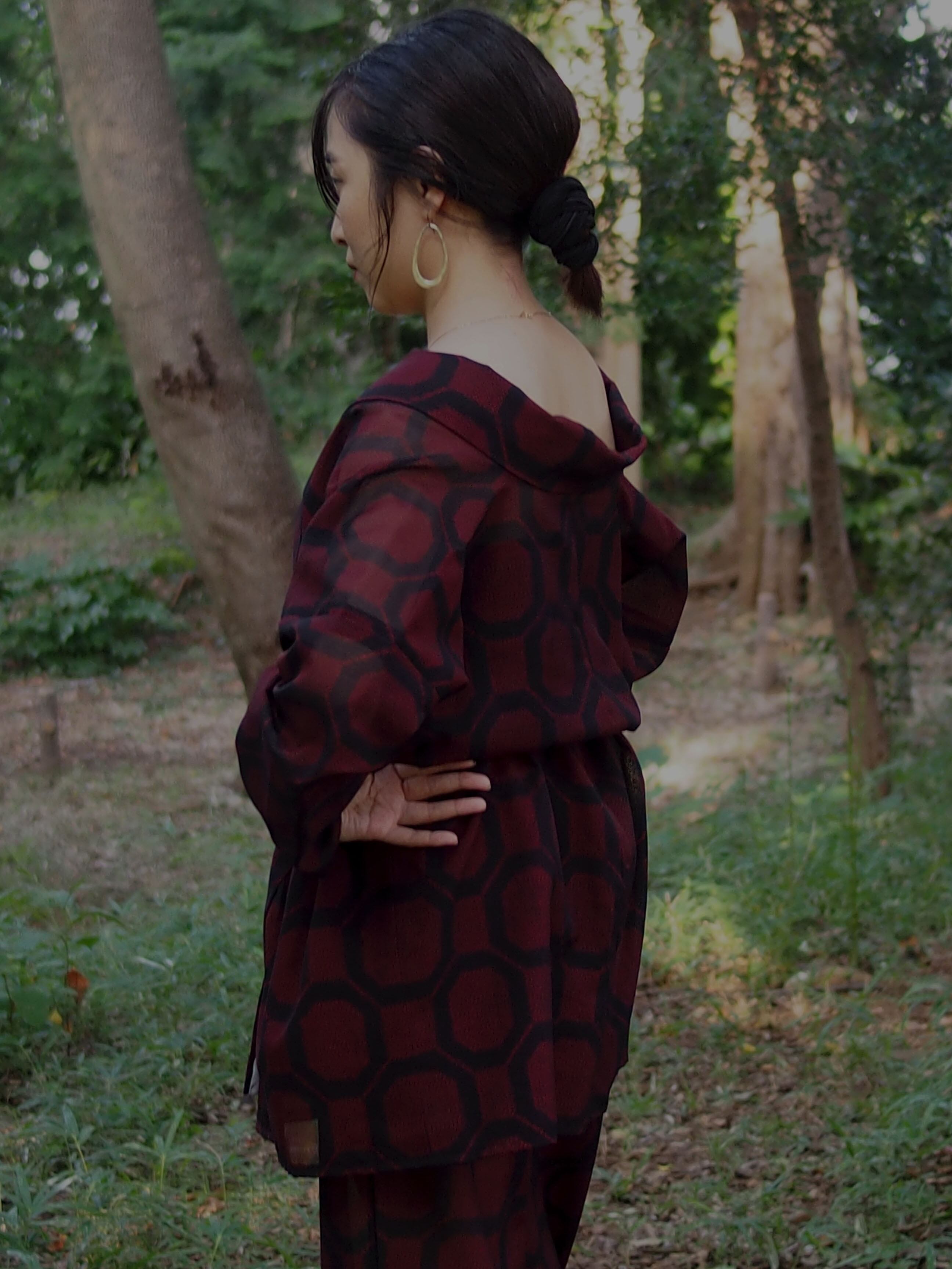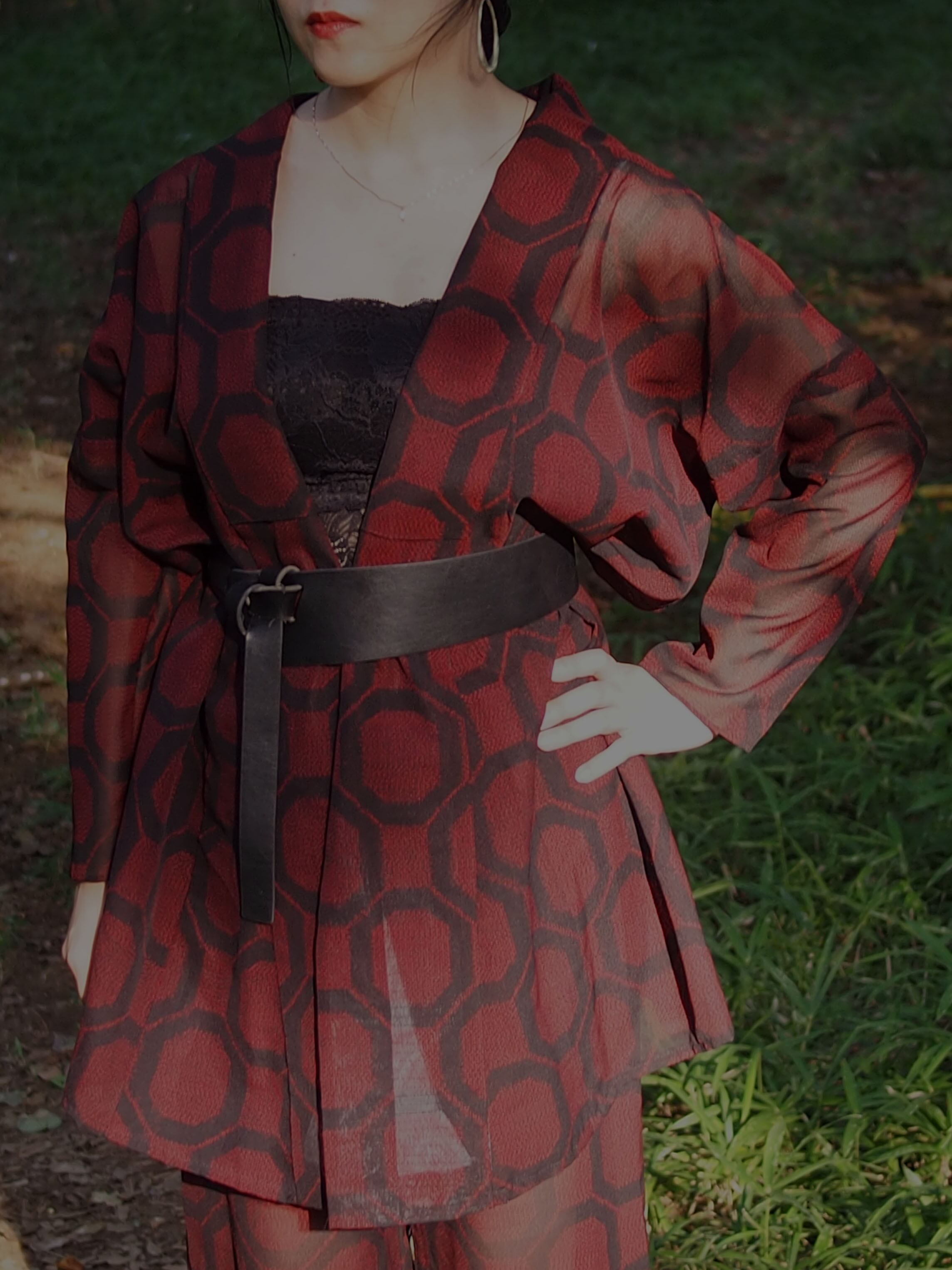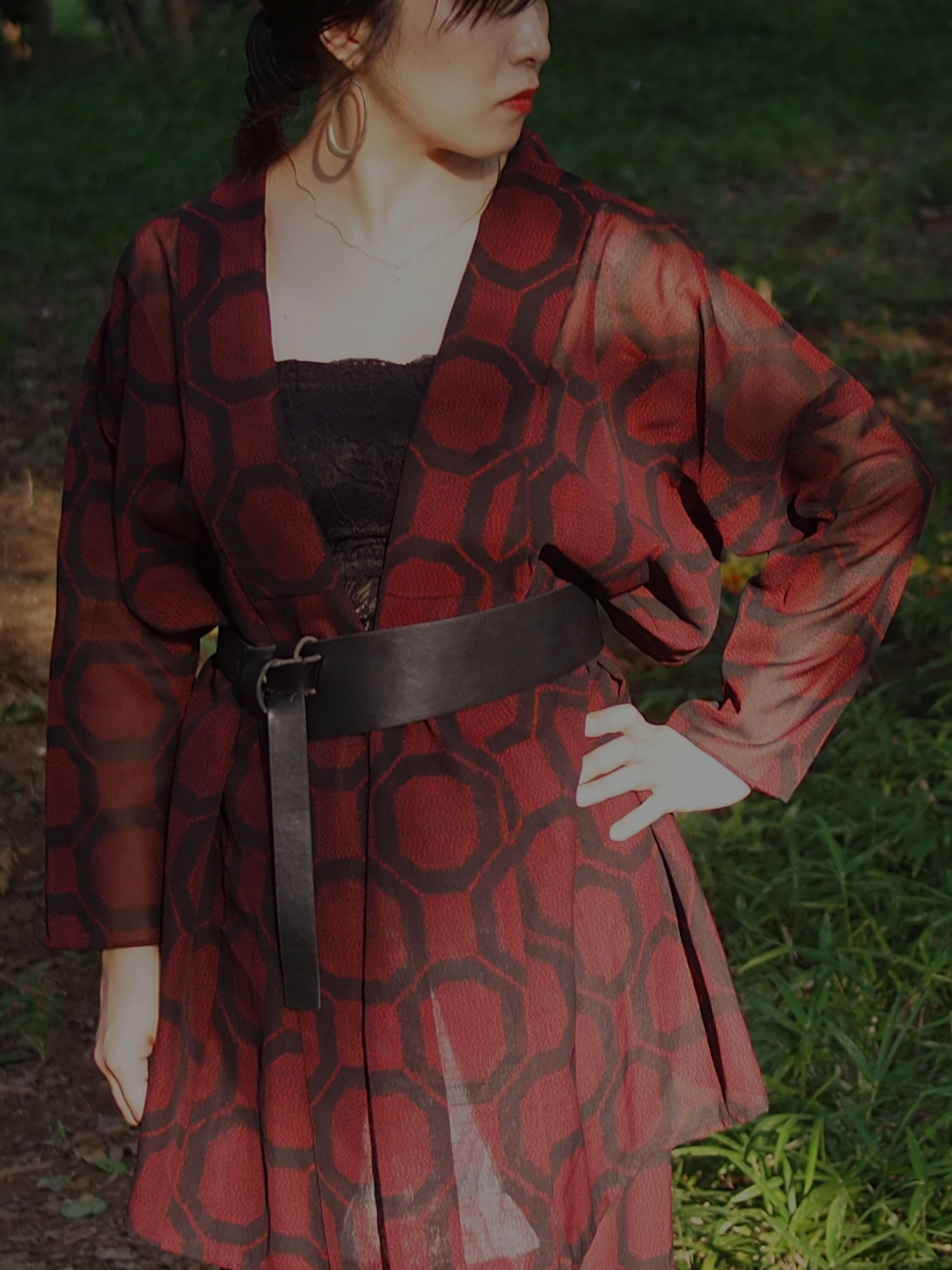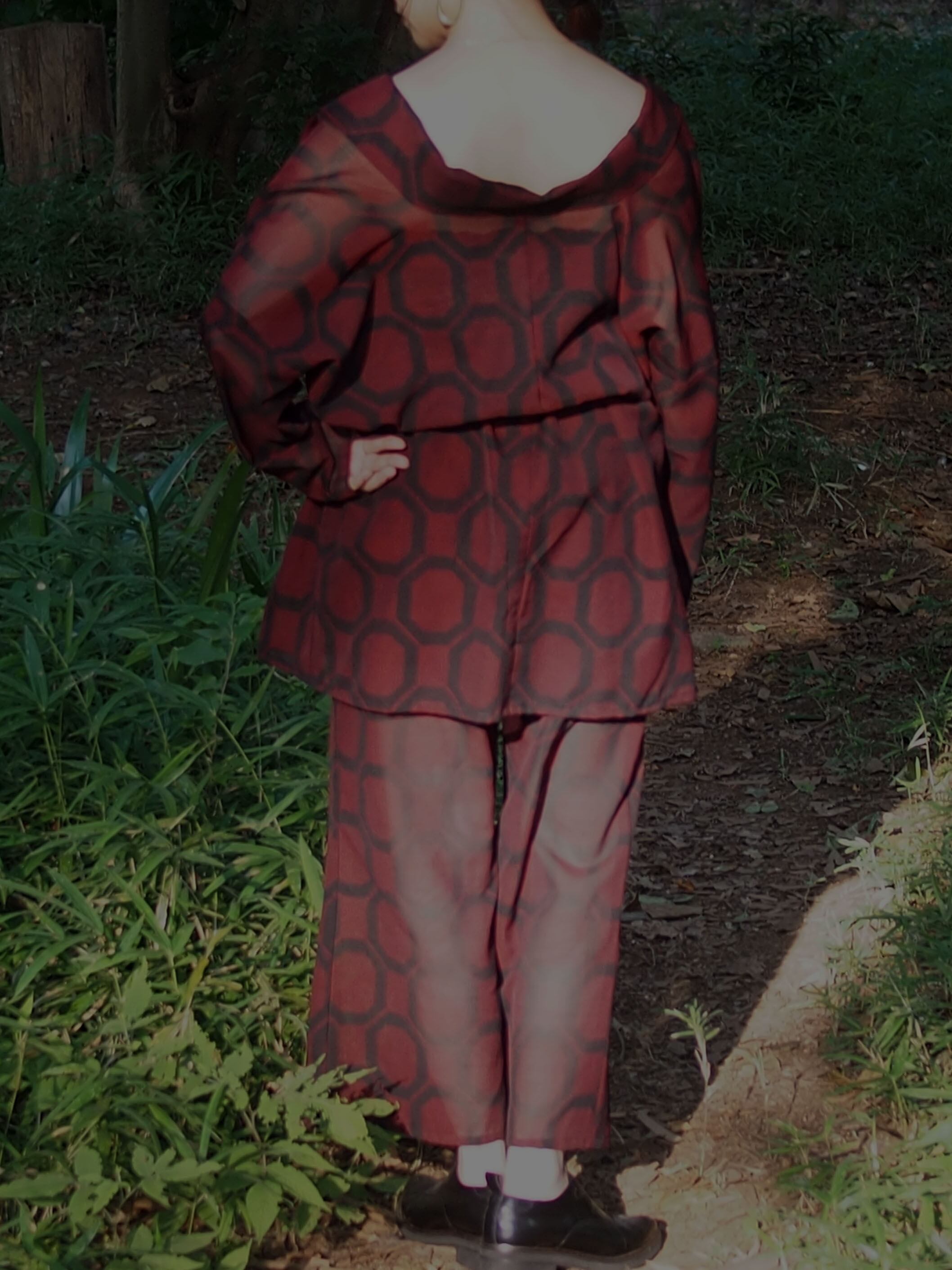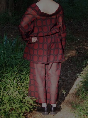 ワインレッドに大判の柄生地がシースルーに透け、なんとも素敵で深みのあるヴィンテージ感を漂わせます。モードな雰囲気で着こなせるお洒落な一枚です。