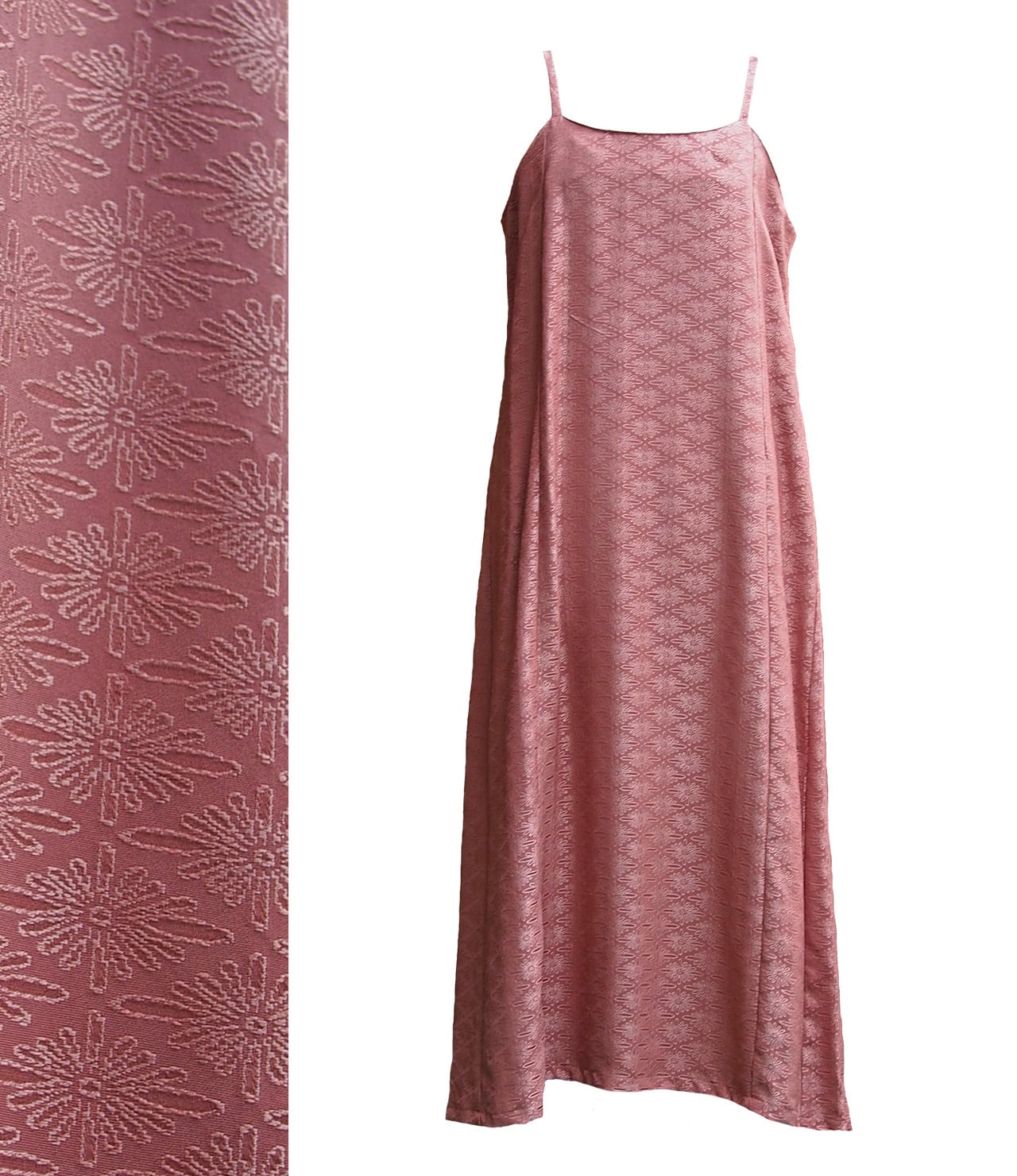 鮮やかなピンクにフラワー刺繍が施された着物生地を選定したキャミワンピース。