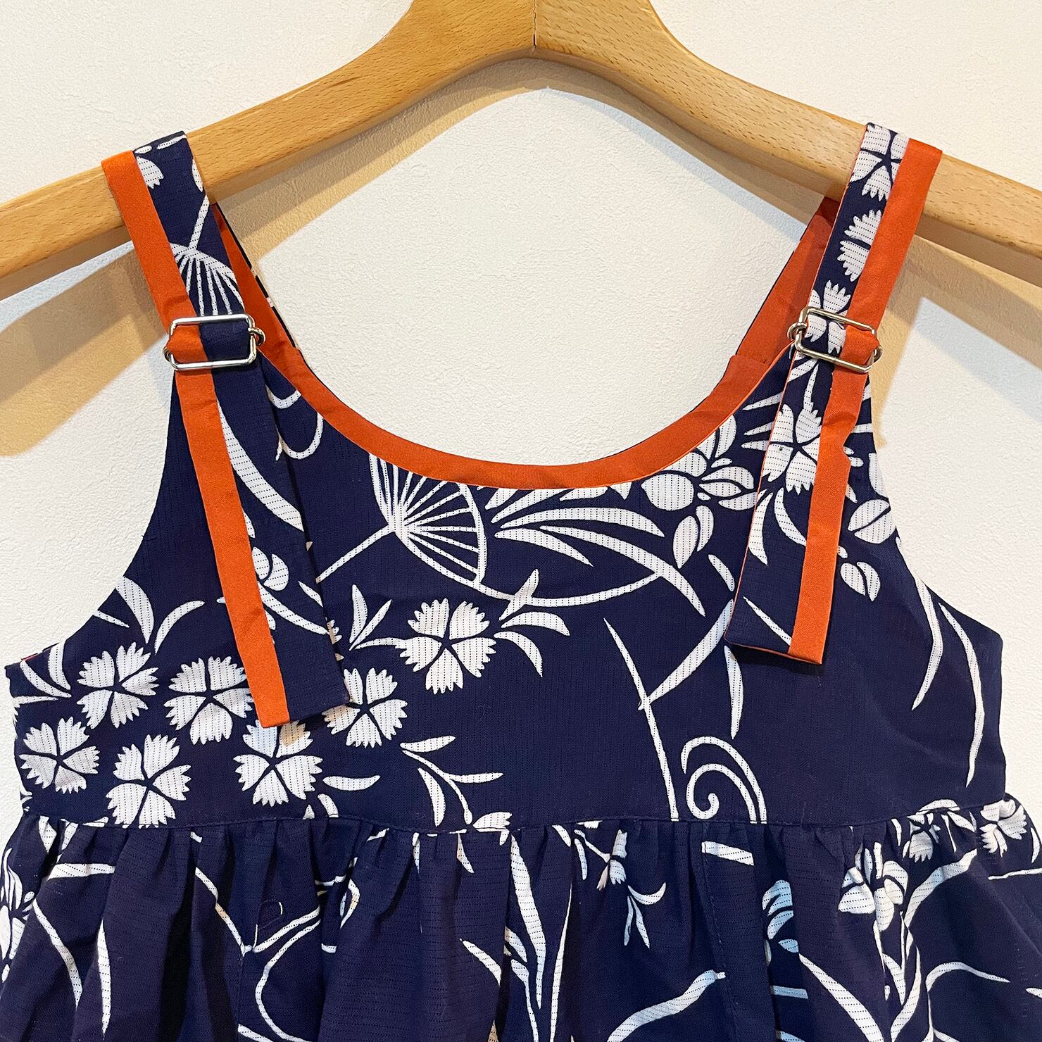 絽のお着物を娘さんのワンピースへ作り替え残したいとのオーダーをいただき、制作させていただきました。ワンピース、またはまだまだ成長してもチュニックとして長く着ていただけるように、アジャスター仕様にし調整できるようにし、140サイズでのオーダーでしたが身幅等は大きめに制作させていただいております。帯締め絞り巾着バッグは残布によってサービスでつけさせていただいております。