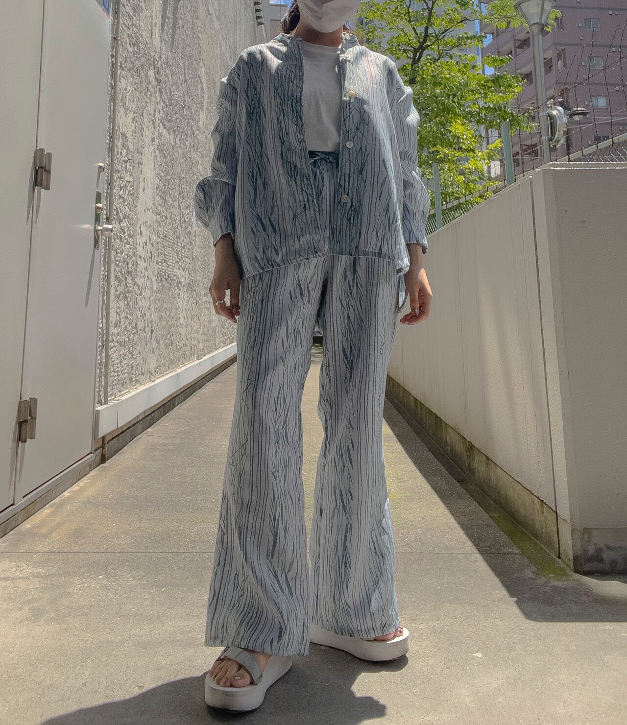 スタンドカラーブラウスとイージーパンツのセットアップアイテム。