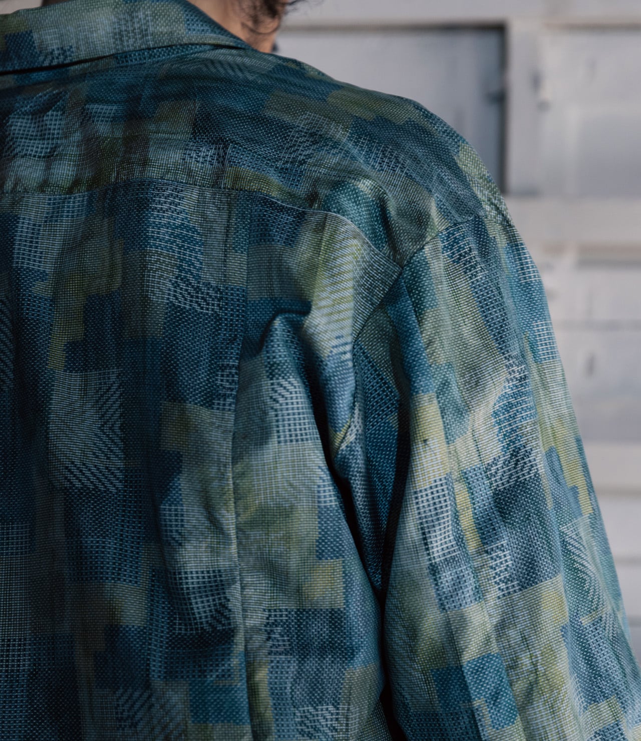 モザイク柄のような水色と黄緑系の混合した柄が目を引く織りの正絹生地を選定したレギュラーカラーシャツ。もちろん一点ものでなんとも言えないモダンな柄がたまらない一枚。