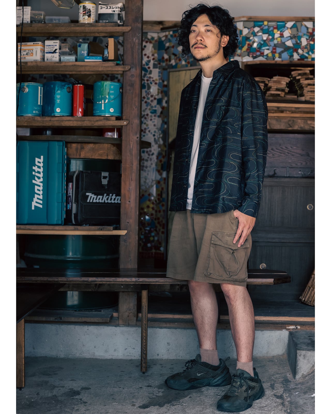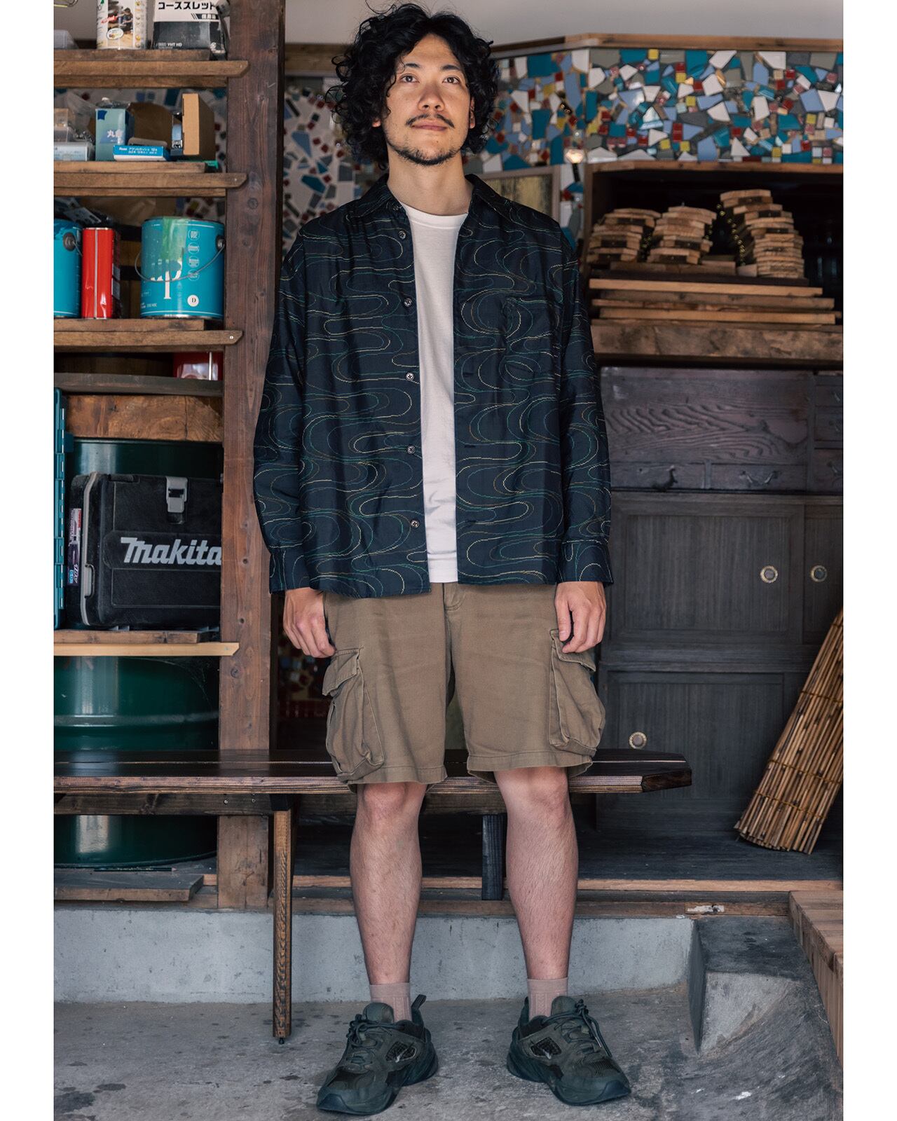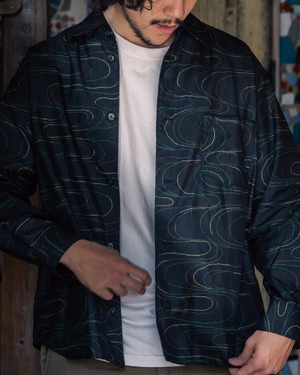 珍しいモダンな和模様の印象も漂う柄が目を引き、大人の遊びの効いた雰囲気と、ヴィンテージ感、そして羽織るだけでこなれた印象を醸し出すシャツに仕上がりました。