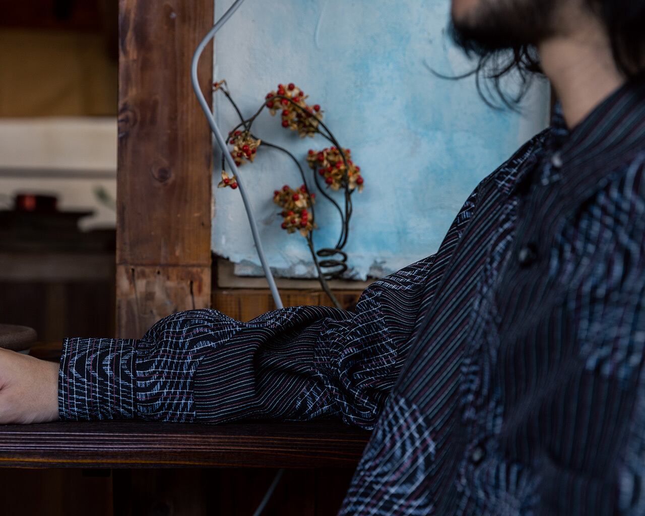 珍しい渋めなモダンな和模模様の印象が漂い、大人の渋さとエッジの効いたヴィンテージ感、そして羽織るだけで上品で高貴な印象を醸し出すシャツに仕上がりました。
