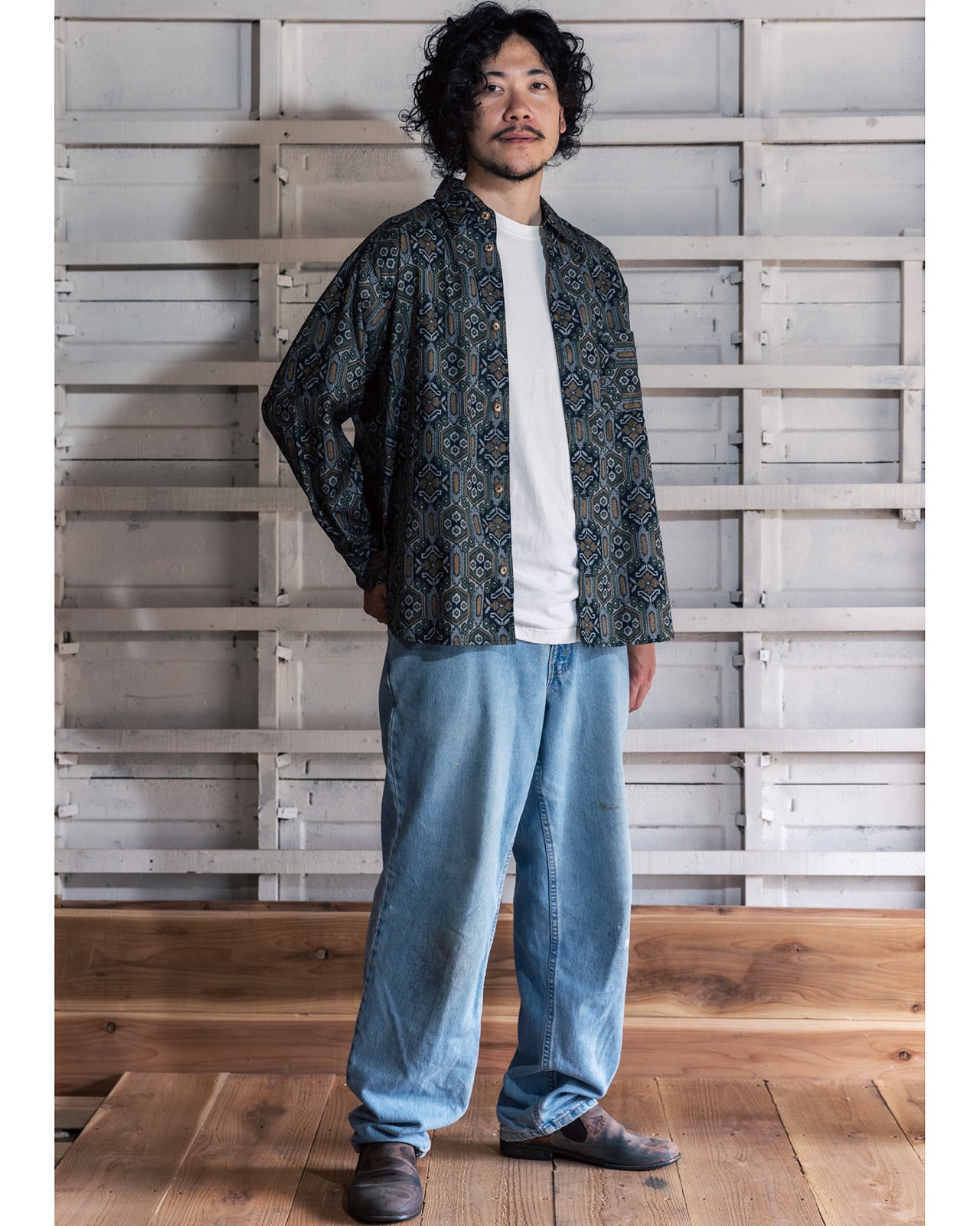 モダンな風合いも感じるグリーンにマスタードカラーの龍郷柄のような幾何学模様は渋めな発色と風合いが目を引き、大人の遊びの効いた雰囲気と、ヴィンテージ感、そして羽織るだけでこなれた印象を醸し出すシャツに仕上がりました。