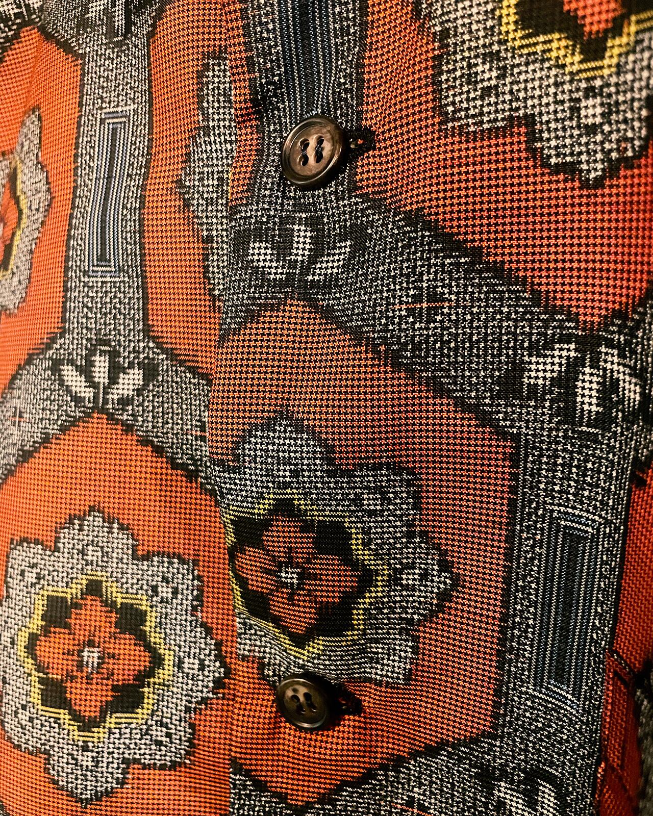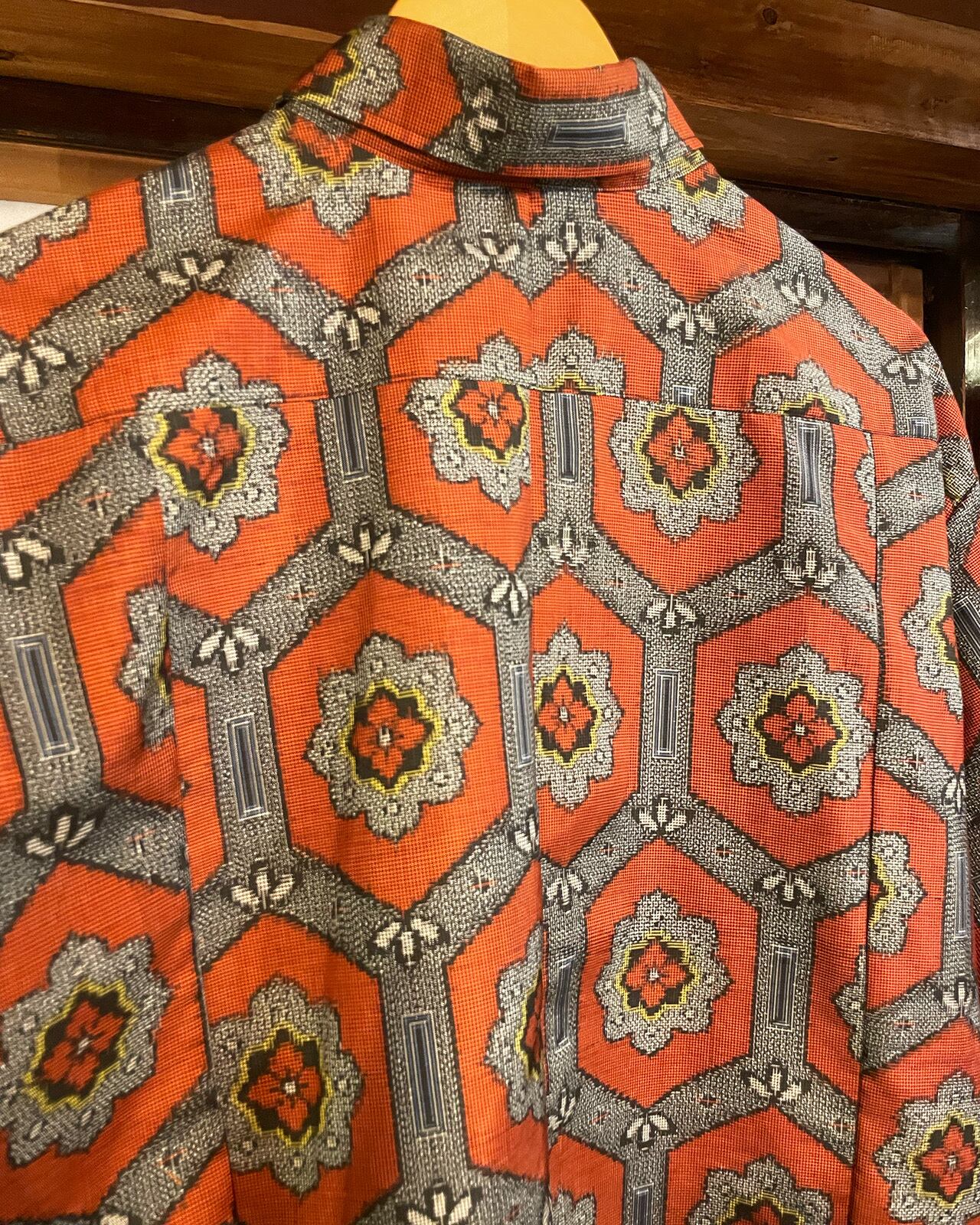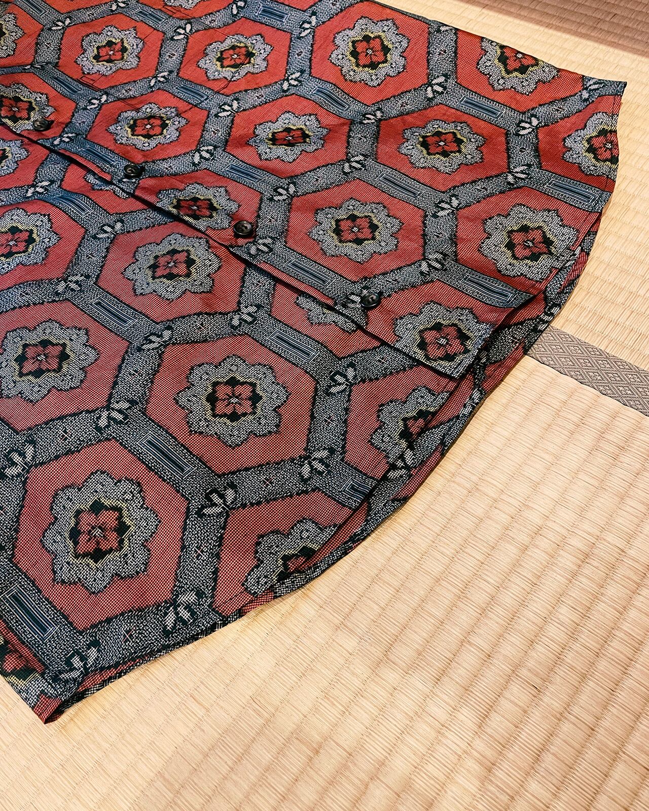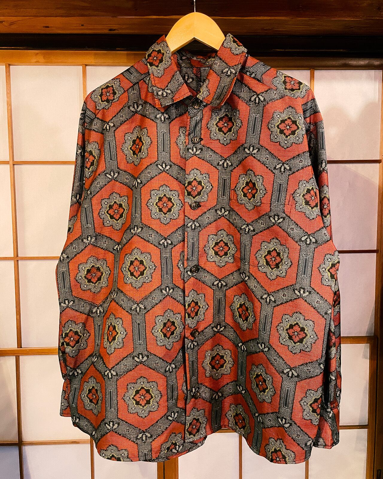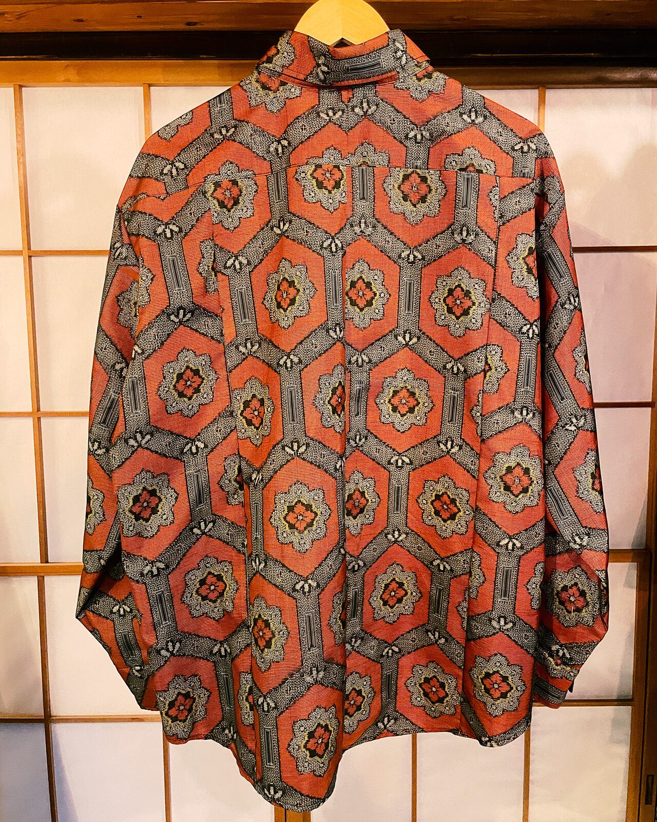 職人の手によって一点一点丁寧に作られた生地の風合いや柄の美しさを感じます。シャツとして羽織るだけで上品な雰囲気に。和と洋、どちらも感じられる独特の印象は正絹生地、また龍郷模様ならではの逸品。