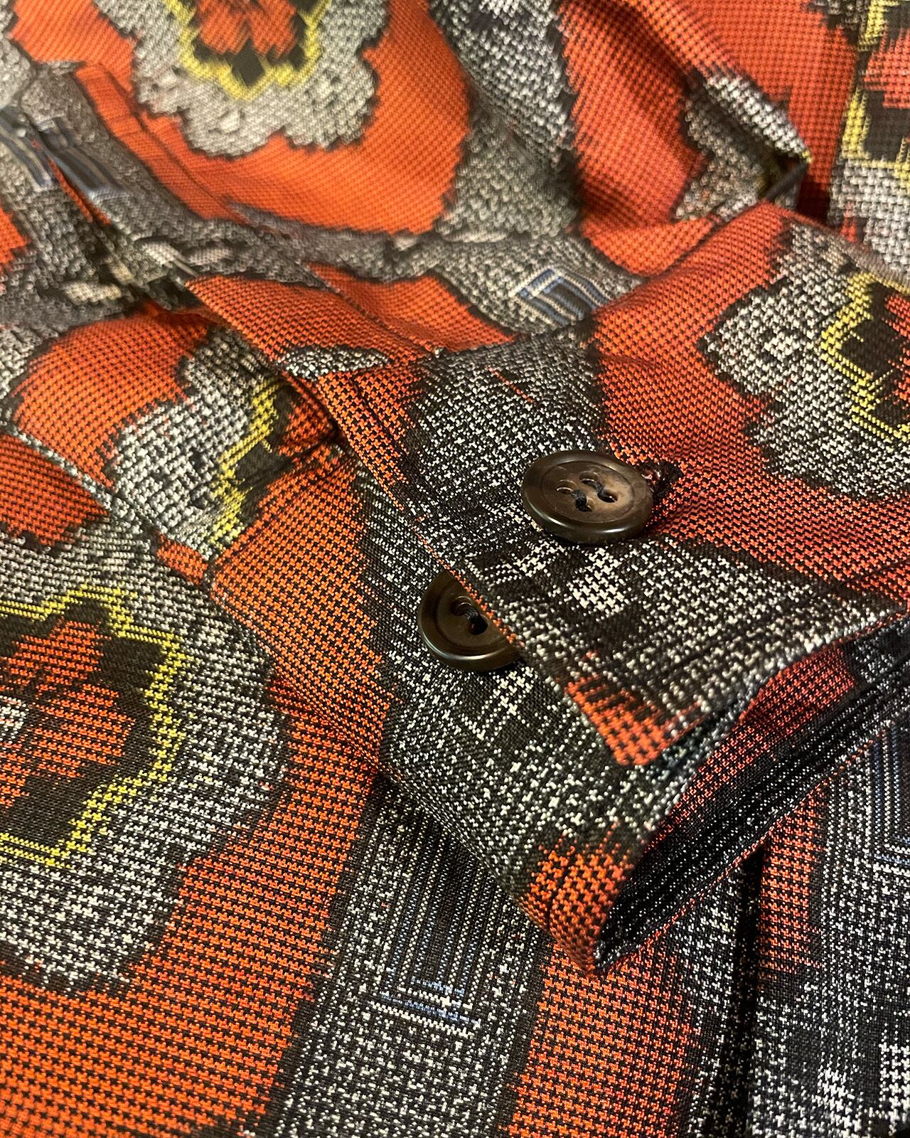日本の伝統的な技法を取り入れた印象的な龍郷模様の紬を選定し、モダンな雰囲気の漂う存在感のある模様が目を引く一枚。紬特有の高級感と張りがあり、職人の技が光る繊細でしっかりとした濃密な生地感は上質で高貴な雰囲気を醸し出すレギュラーカラーシャツ。