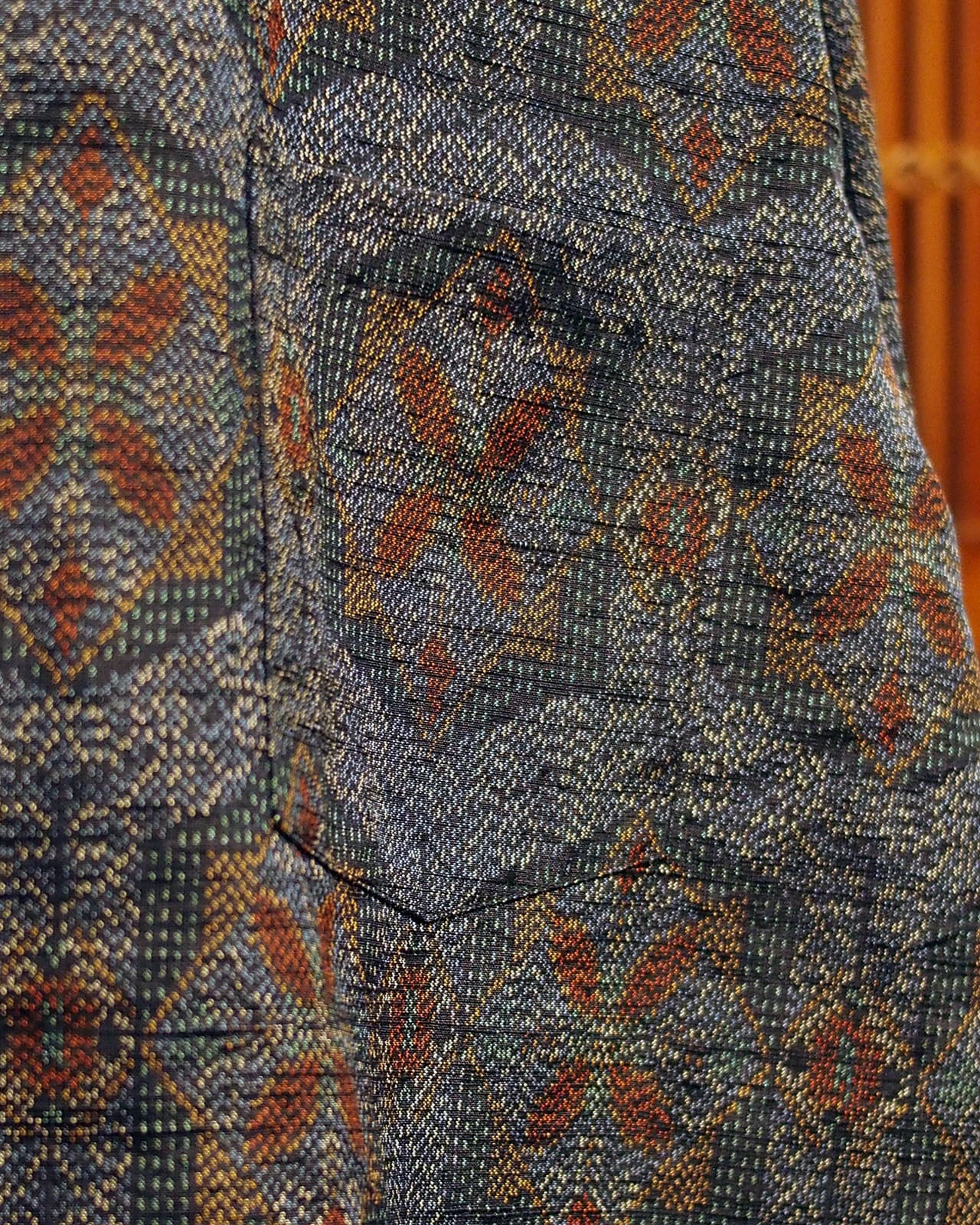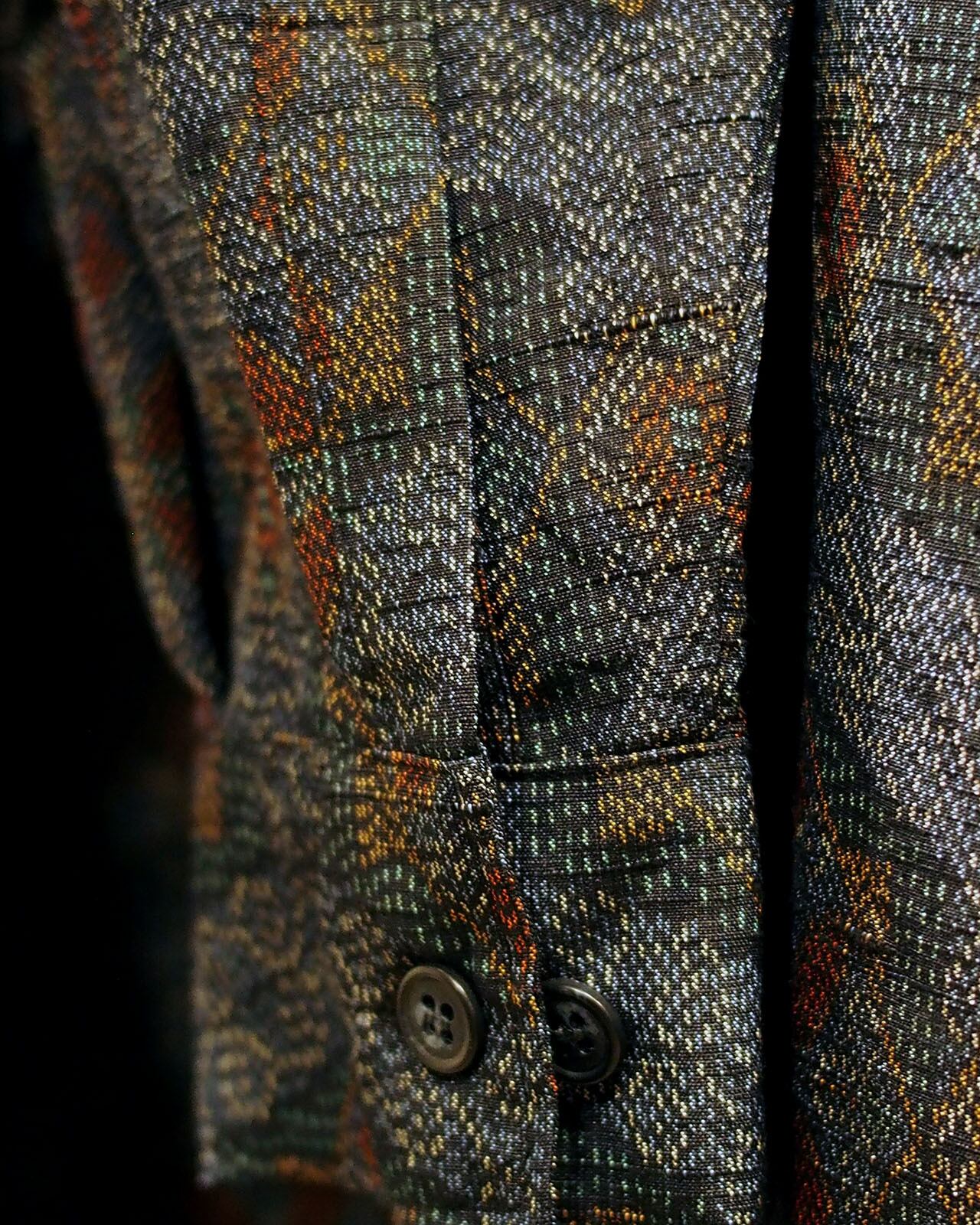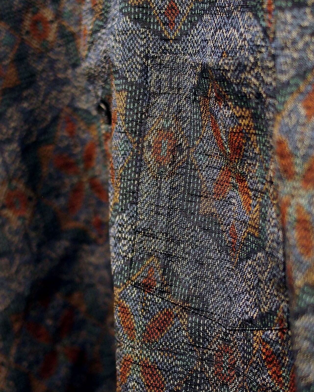 日本の伝統的な技法を取り入れた印象的な着物を選定し、ネイティブな雰囲気の漂う幾何学模様が存在感のある一枚。絹特有の高級感と張りがあり、職人の技が光る繊細でしっかりとした濃密な生地感は上質で高貴な雰囲気を醸し出します。