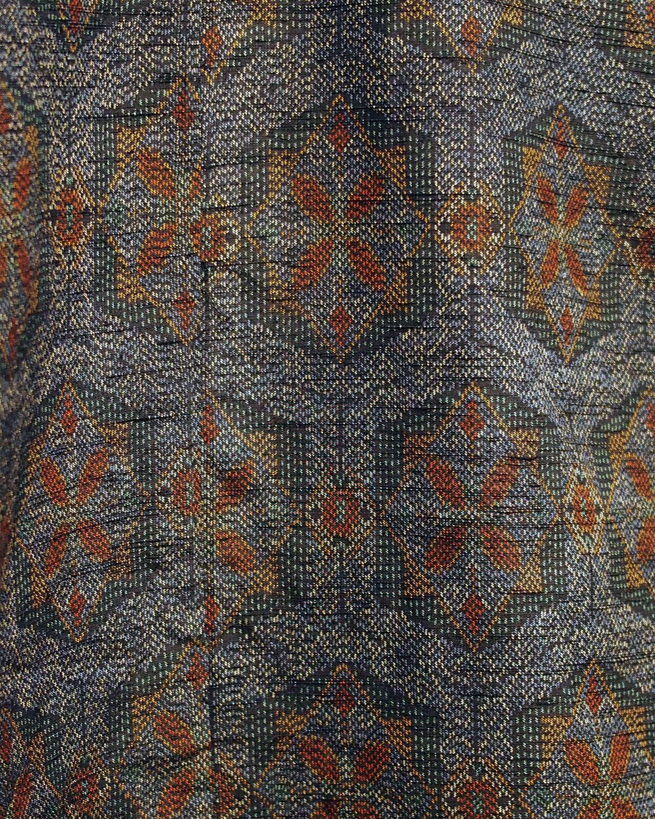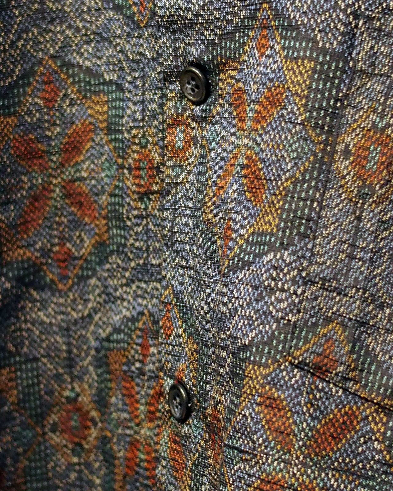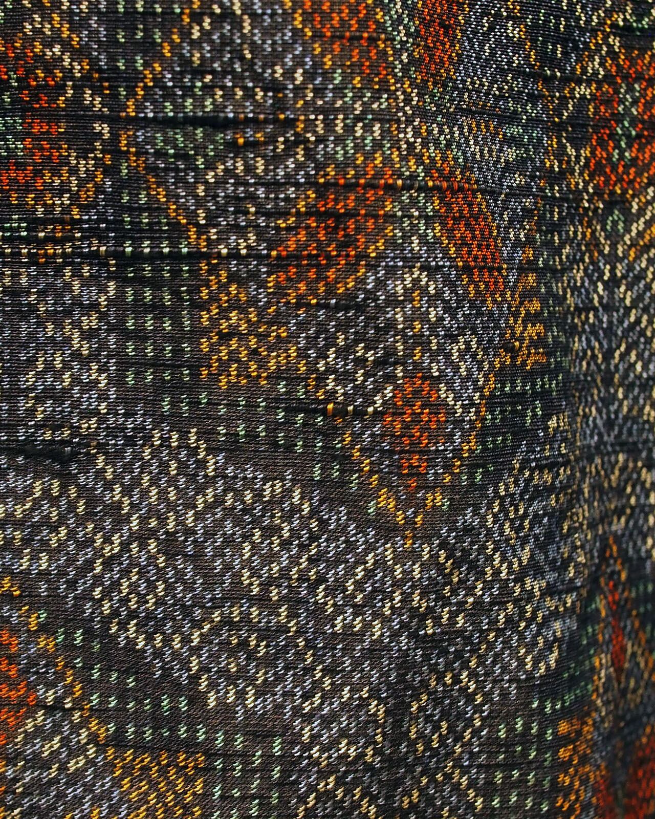 日本の伝統的な技法を取り入れた印象的な着物を選定し、ネイティブな雰囲気の漂う幾何学模様が存在感のある一枚。絹特有の高級感と張りがあり、職人の技が光る繊細でしっかりとした濃密な生地感は上質で高貴な雰囲気を醸し出します。