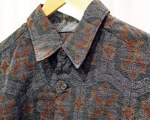 洗練されたデザインとトレンドを反映した、和柄レギュラーカラーシャツ。紺ベースに朱の花模様の幾何学風模様が映え魅力的です。