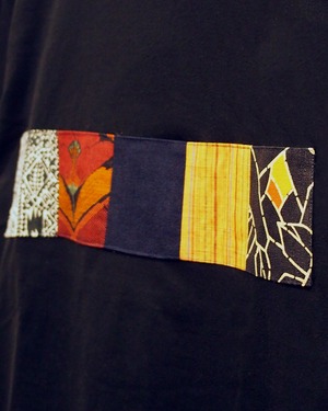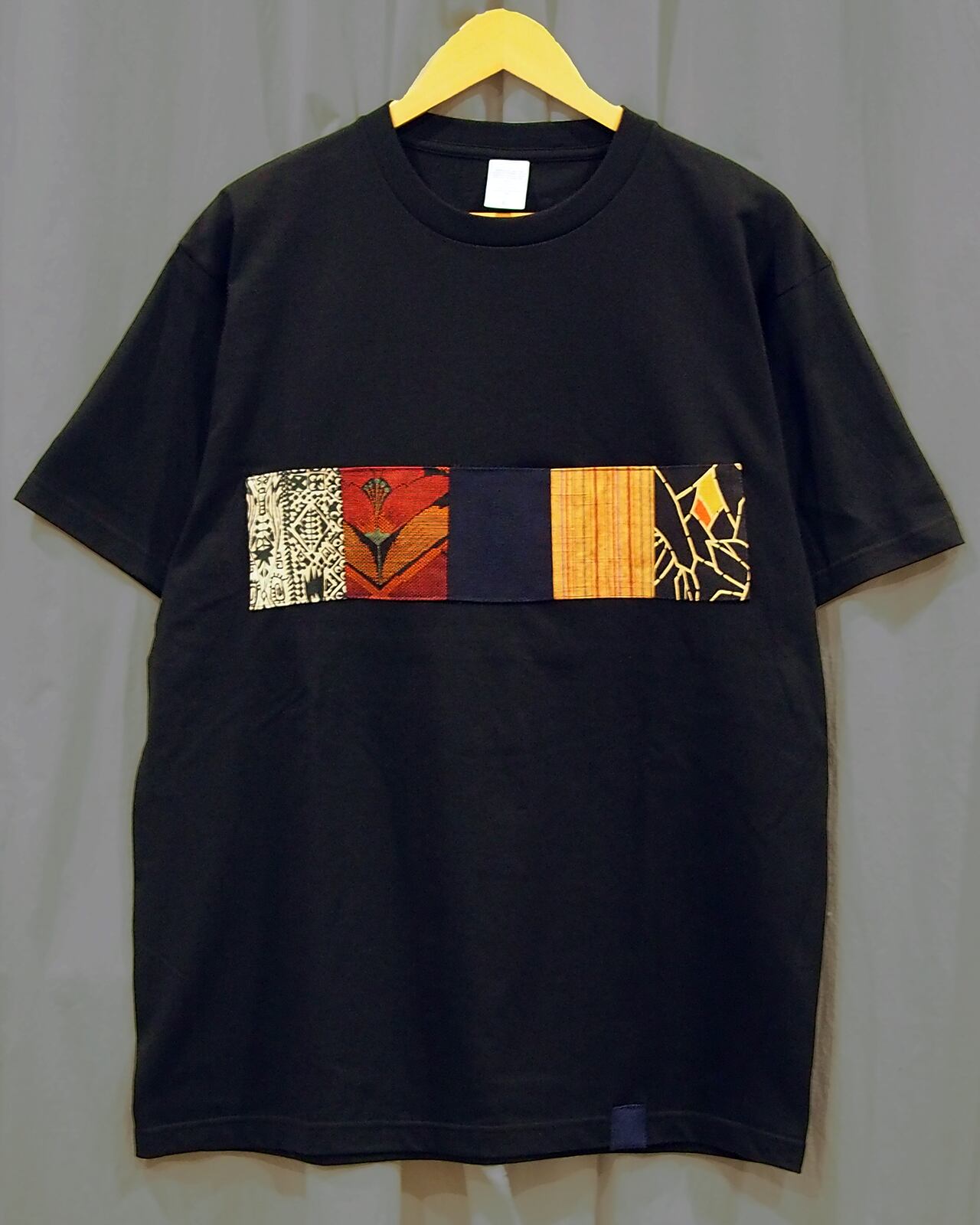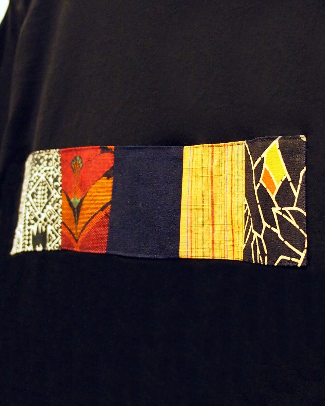 着物生地を贅沢に使用し、パッチワークで構成した印象的な一点ものTシャツです。